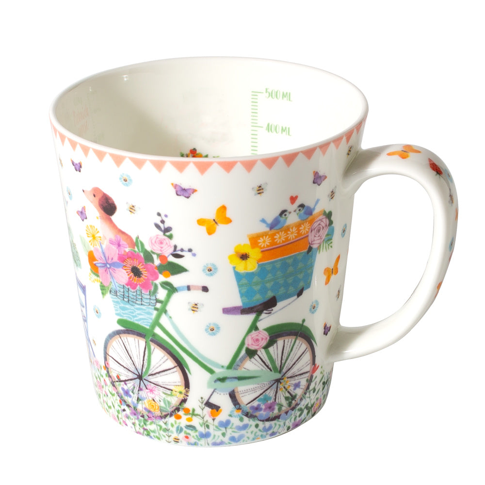 Introducing a fine-bone china mug with a unique design featuring a dog in a basket, a bike, and a flower meadow. The exterior showcases a charming garden scene with bees, butterflies, a garden shack, birdhouses, and a table set for two. Inside, it has an imprint for measurements from 100ml to 500ml and a depiction of the garden table and the dog on a chair. It is ideal for enjoying your favourite beverage.