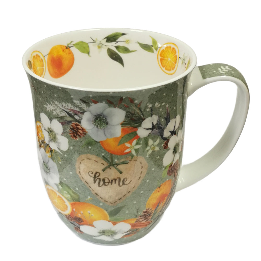 This mug showcases a sophisticated design featuring a floral and orange wreath set against a rich green background. At the centre of the wreath, a heart displays the word "home," evoking warmth and comfort. Designed for both aesthetic appeal and practicality, the mug provides a comfortable hold and generous capacity, making it perfect for cozy moments at home or thoughtful gifting during winter. Its detailed illustration adds a festive yet timeless touch to any collection.