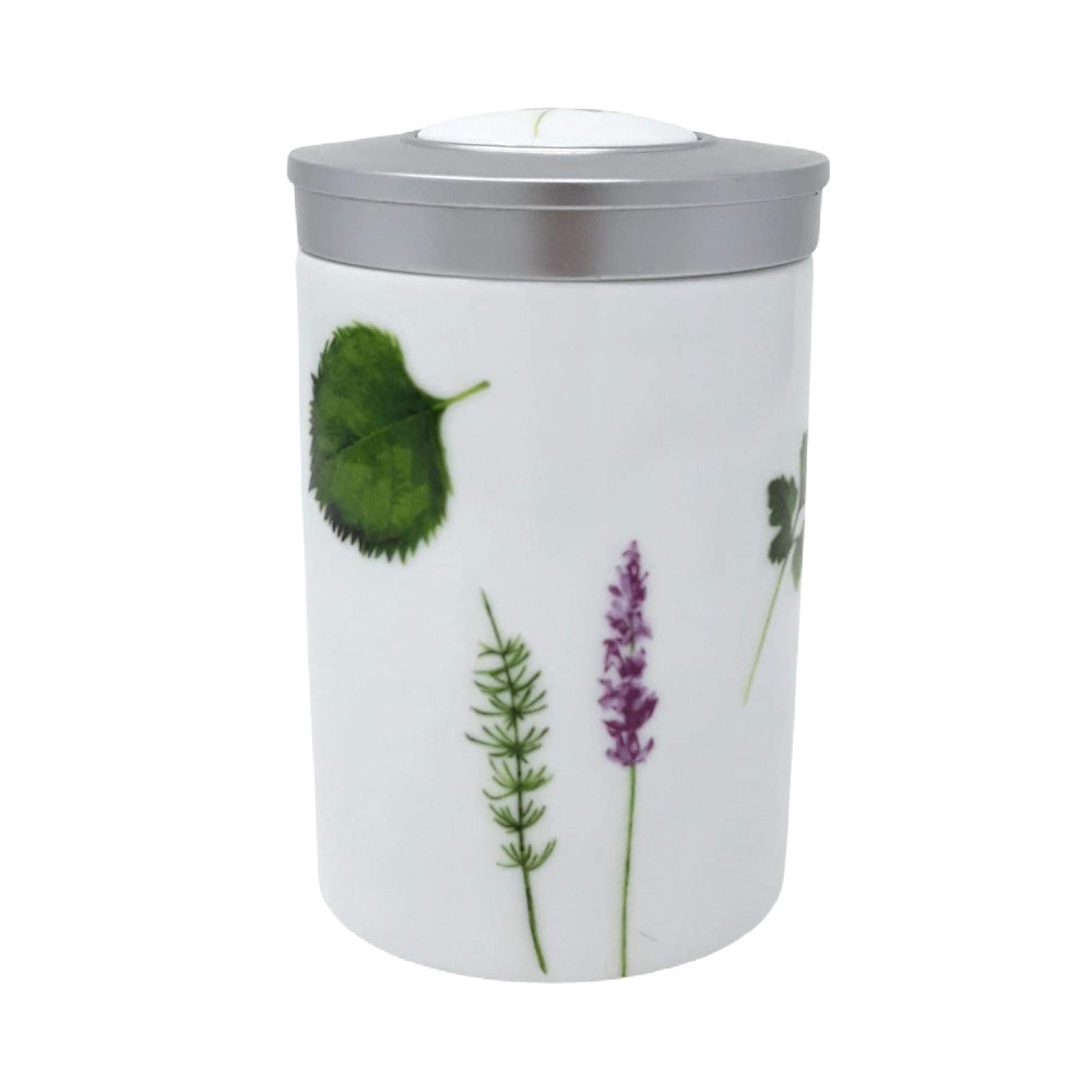 This elegant Prima Vera tea container, crafted from porcelain, ensures the freshness and flavor of your favorite tea. Its carefully designed silicon rim helps seal in the tea's aroma, and it is dishwasher safe for easy cleaning. With its light herbal design, it is the perfect addition to your kitchen.