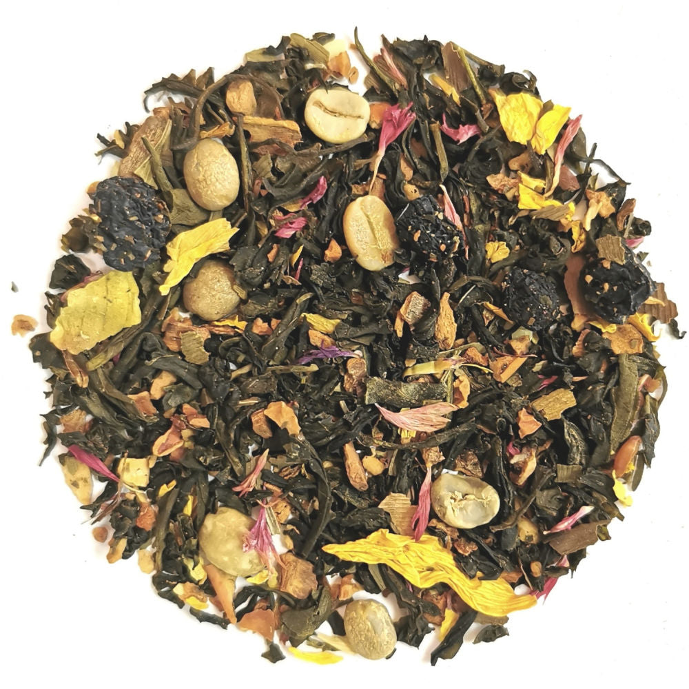 Ingredients: green tea, green coffee beans, apple bits, chokeberries (aronia), cinnamon bits, ginkgo leaves, natural flavouring, sunflower blossoms, natural ylang-ylang flavouring, red cornflower blossoms.