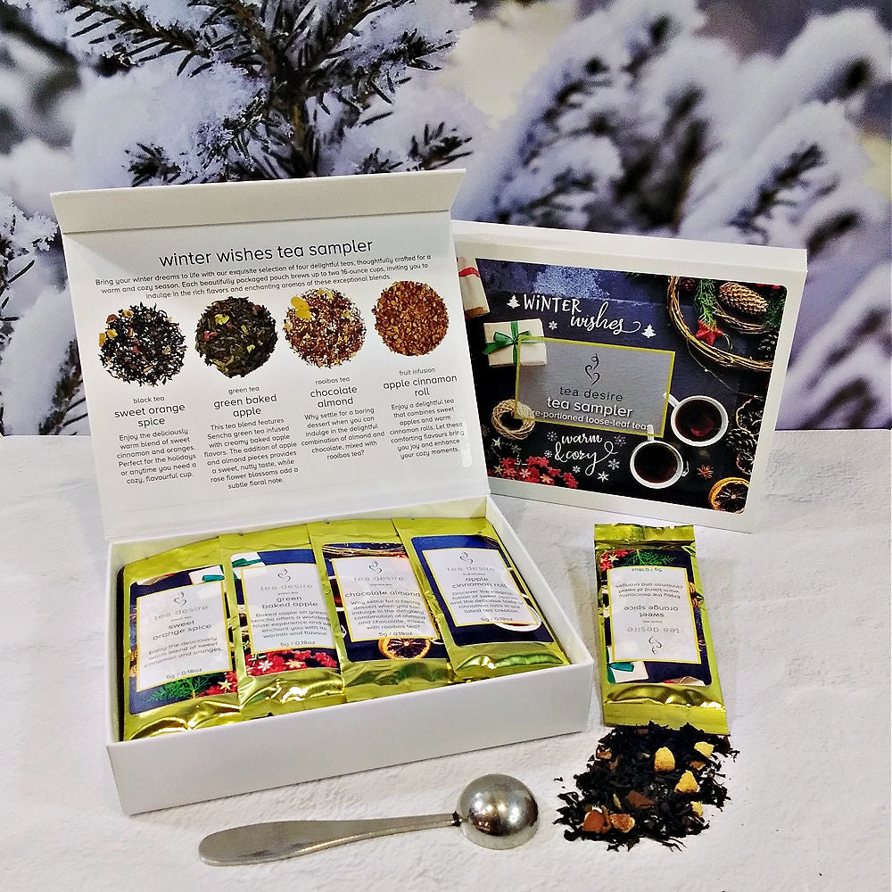 Bring your winter dreams to life with our exquisite selection of four delightful teas, thoughtfully crafted for a warm and cozy season. Each beautifully packaged pouch brews up to two 16-ounce cups, inviting you to indulge in the rich flavours and enchanting aromas of these exceptional blends.