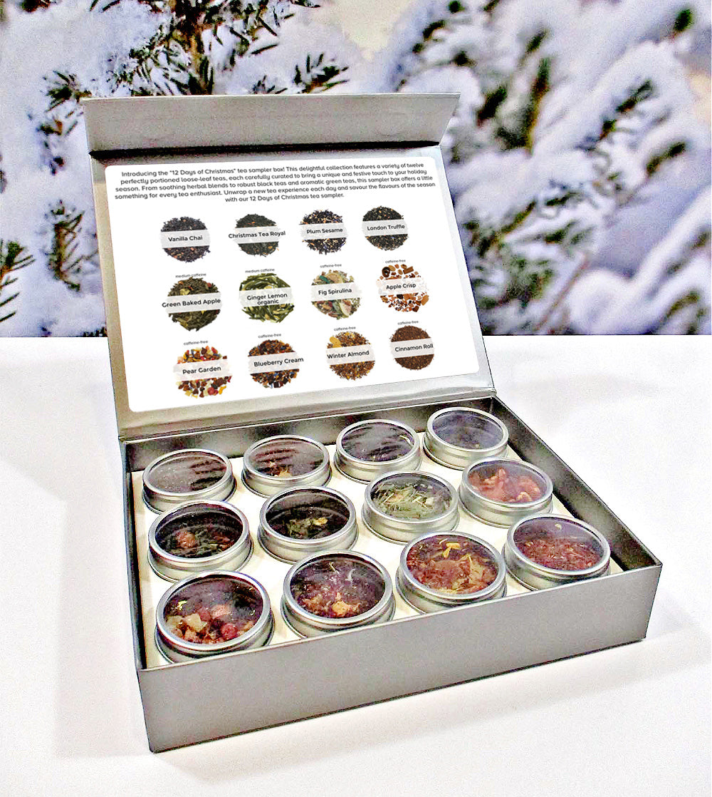 Introducing the "12 Days of Christmas" tea sampler box! This delightful collection features a variety of twelve perfectly portioned loose-leaf teas, each carefully curated to bring a unique and festive touch to your holiday season. From soothing herbal blends to robust black teas and aromatic green teas, this sampler box offers a little something for every tea enthusiast. Unwrap a new tea experience each day and savour the flavours of the season with our 12 Days of Christmas tea sampler.