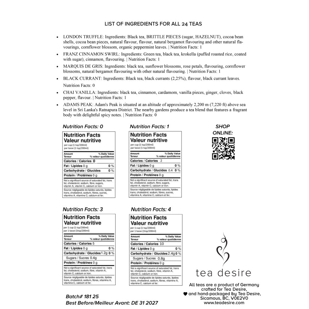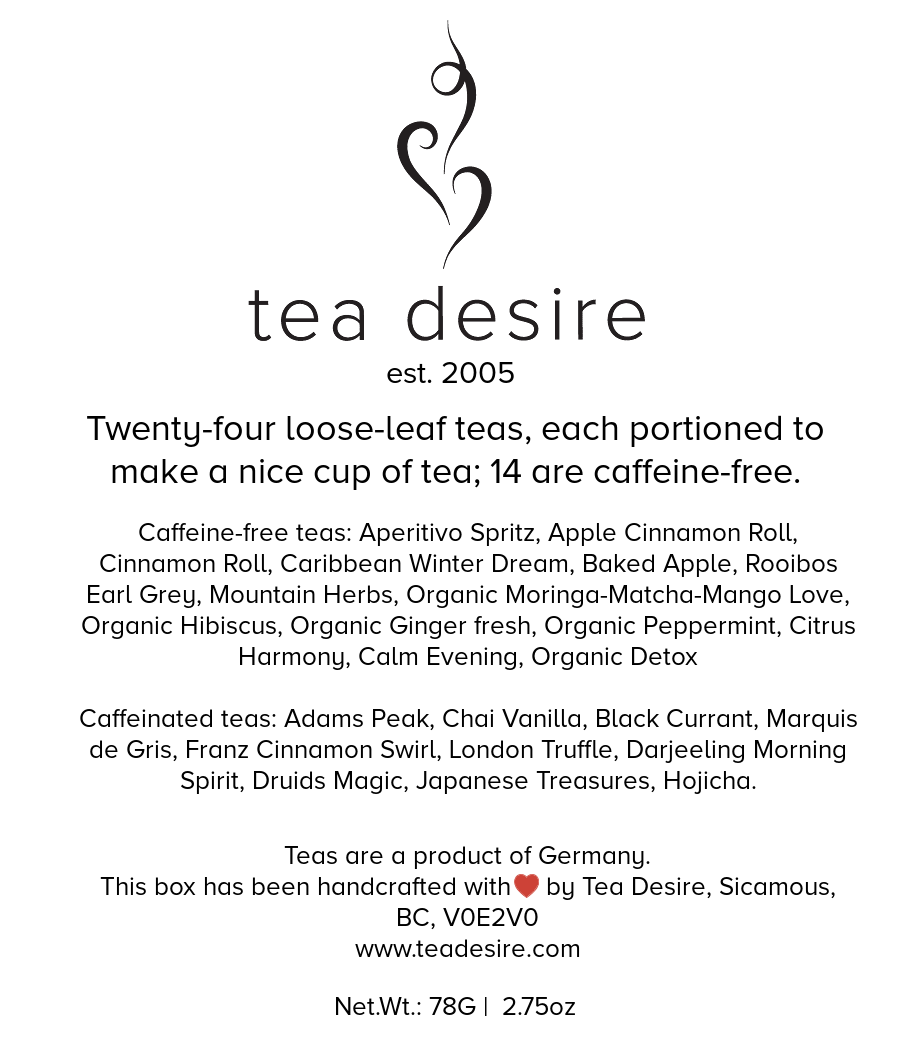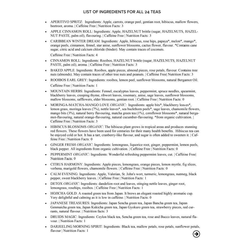 As you gear up for the holiday season, dive into a truly exceptional tea experience with our updated 24 Days of Tea Advent Calendar for this year! Nestled within our Deluxe Tea Box, you'll discover 24 unique high-quality loose-leaf teas, each thoughtfully chosen to bring you delightful surprises every day as you count down to Christmas. Enjoy a soothing selection of Wellness and Herbal teas, refreshing Fruit Infusions, the comforting depth of Rooibos, and the classic essence of Black and Green Teas. Take a moment to explore our diverse tea list below, and get ready to be enchanted by the intricate flavours that await you. This remarkable gift isn’t just for sharing—it’s also a wonderful daily ritual of self-care and indulgence just for you. Plus, once the Advent calendar journey comes to a close, the Magnetic Box can become a treasured keepsake, holding the memories of this unique experience for years to come. ✨