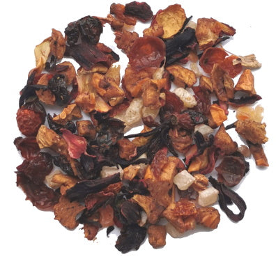 Ingredients: Apple, hibiscus, rose hips, papaya*, pineapple*, sloes, cherries, flavour. *Contains cane sugar, citric acid and calcium chloride (binder). May contain traces of coconuts.